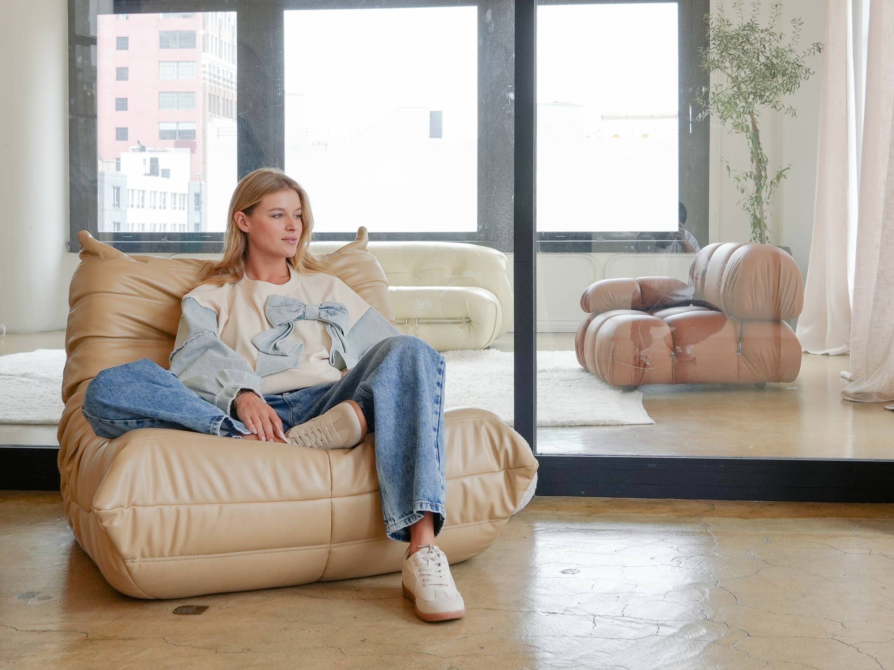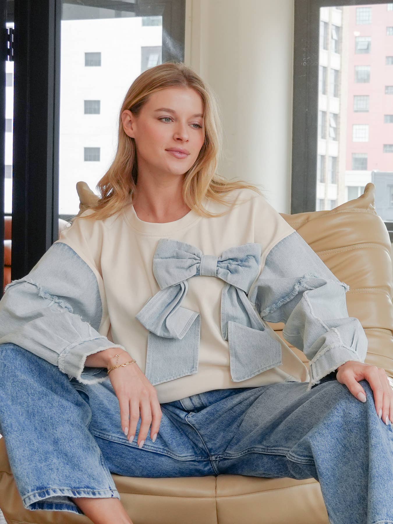 Mineral Washed Denim Bow Sweatshirt Top