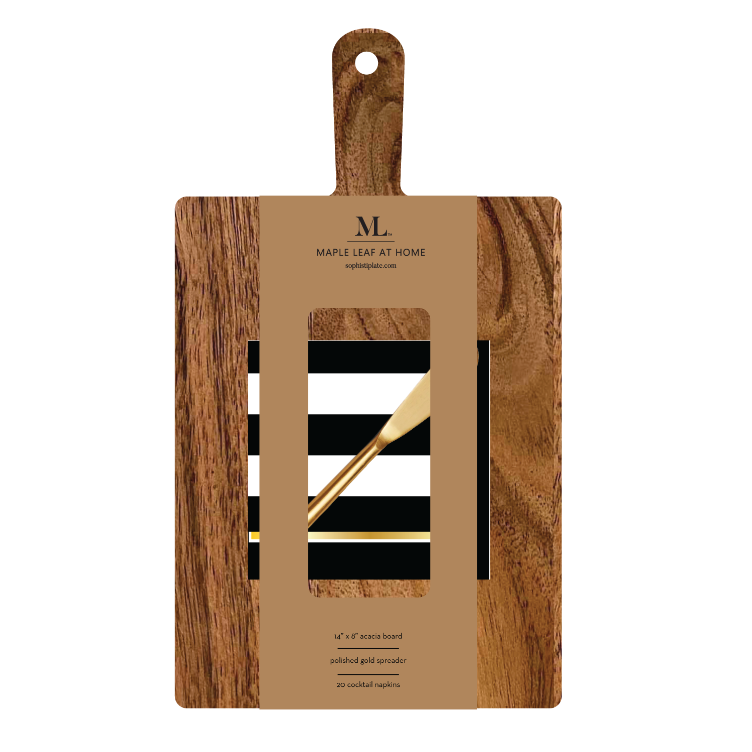 14x8" Acacia Board w/ Handle Gold Spreader, Timeless Napkin