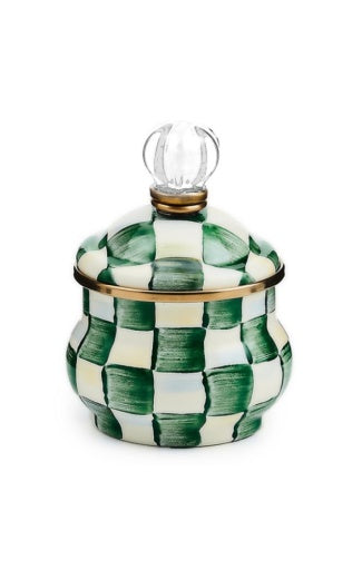 Heavy-gauge, hand-glazed steel underbody with hand-painted Emerald Checks, rimmed in bronzed stainless steel. Lid is topped with glass and brass accents. Pieces may vary due to the handmade nature of each product. Imported.