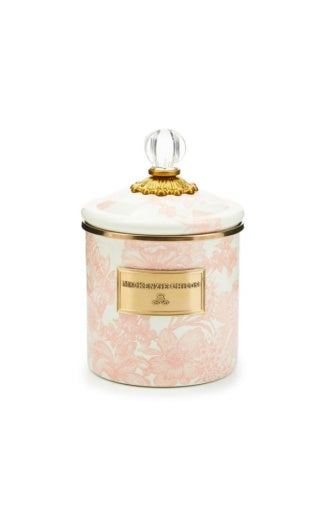 Heavy-gauge, hand-glazed steel underbody embellished with hand-applied transfers, rimmed in bronzed stainless steel. Lid is topped with a glass finial. Silicone seal inside lid. Pieces may vary due to the handmade nature of each product. Imported.
