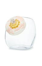 Glass jar; lid has heavy-gauge, hand-glazed steel underbody with hand-applied transfers. Knob assembly includes brass bobeche and glass finial. Pieces may vary due to the handmade nature of each product.