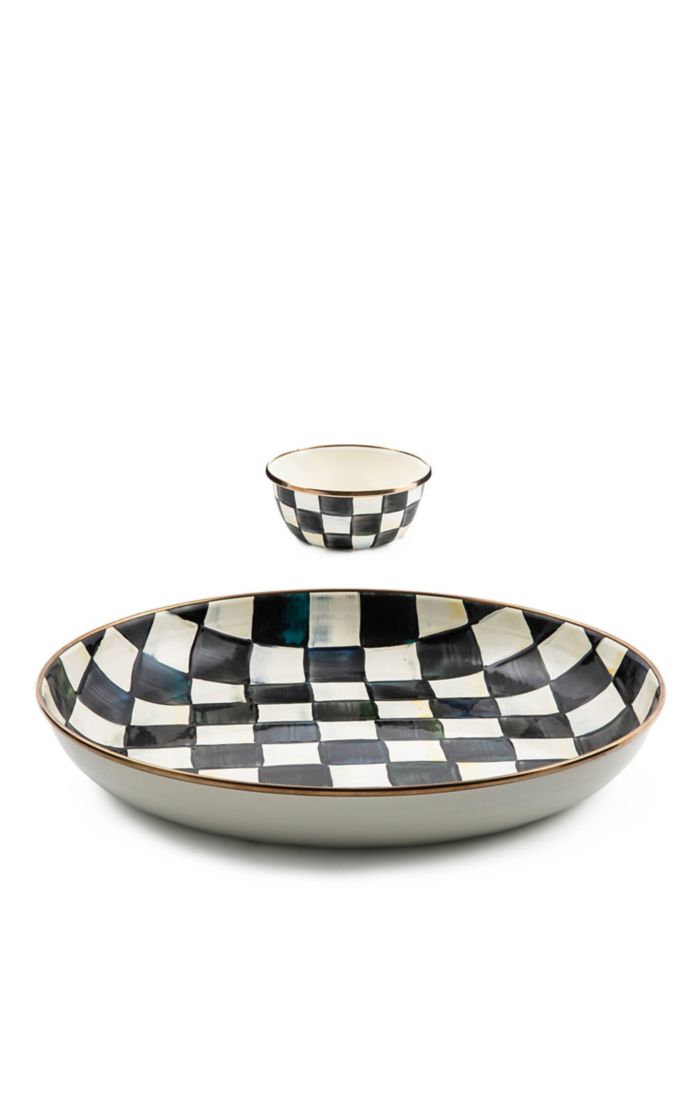 Heavy-gauge, hand-glazed steel underbody with hand-painted Courtly Checks, rimmed in bronzed stainless steel. Pieces may vary due to the handmade nature of each product. Imported.
