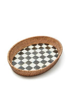 Heavy-gauge, hand-glazed steel tray base with hand-painted Courtly Checks, rimmed in woven rattan. Pieces may vary due to the handmade nature of each product. Imported.