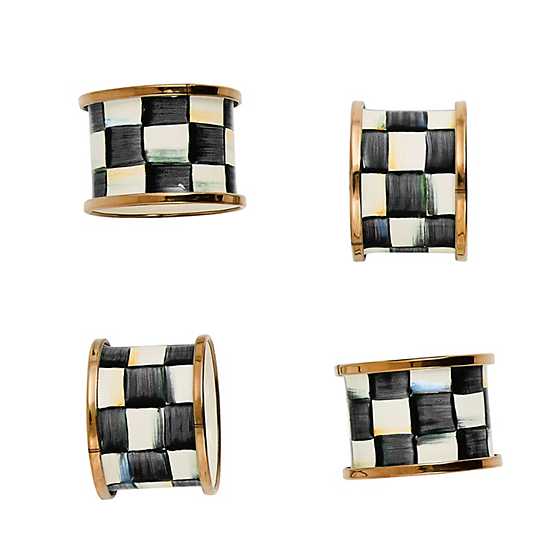 Heavy-gauge, hand-glazed steel underbody with hand-painted Courtly Checks, rimmed in bronzed stainless steel. Boxed set of four. Pieces may vary due to the homemade nature of each product. Imported.