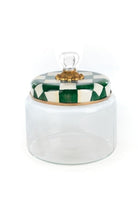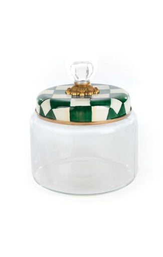 Glass canister and heavy-gauge enameled steel lid rimmed in bronzed stainless steel with glass and brass accents. Pieces may vary due to the handmade nature of each product. Imported.