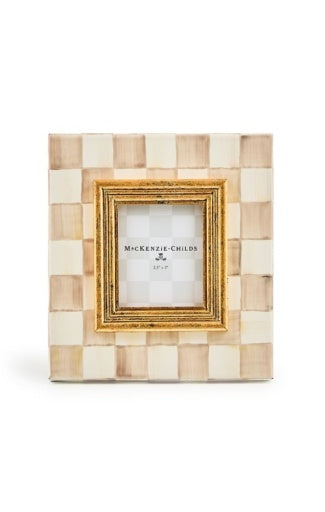 Heavy-gauge, hand-glazed steel underbody with hand-painted Mocha Checks. Glass pane. Easel back included; backing is covered with linen and a brass logo plate. Pieces may vary due to the handmade nature of each product. Imported.