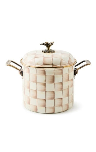 Hand-glazed, heavy-gauge steel underbody with hand-painted Mocha Check decoration, bronzed stainless steel rim, and stainless steel knob with antique brass finish. Pieces may vary due to the handmade nature of each product. Imported.