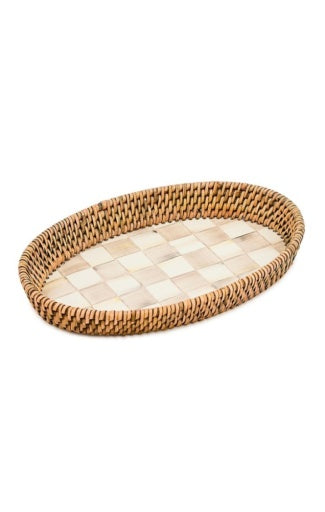 Heavy-gauge, hand-glazed steel tray base with hand-painted Mocha Checks, rimmed in woven rattan. Pieces may vary due to the handmade nature of each product. Imported.
