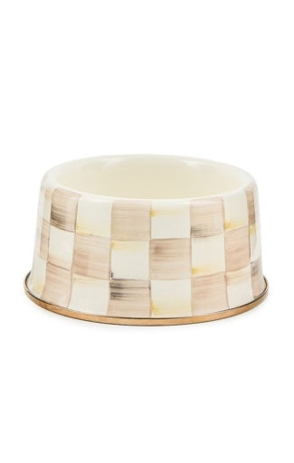 Heavy-gauge, hand-glazed steel underbody with hand-painted Mocha Checks, rimmed in bronzed stainless steel. Pieces may vary due to the handmade nature of each product. Imported.