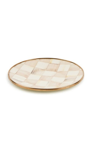 Heavy-gauge, hand-glazed steel underbody with hand-painted Mocha Checks, rimmed in bronzed stainless steel. Pieces may vary due to the handmade nature of each product. Imported.