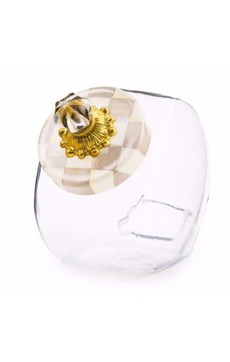 Glass jar; lid has heavy-gauge, hand-glazed steel underbody with hand-painted Mocha Checks. Knob assembly includes brass bobeche and glass finial. Pieces may vary due to the handmade nature of each product.