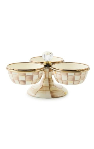 Heavy-gauge, hand-glazed steel underbody with hand-painted Mocha Checks, rimmed in bronzed stainless steel and iron. Glass knob and brass accents. Pieces may vary due to the handmade nature of each product. Imported.