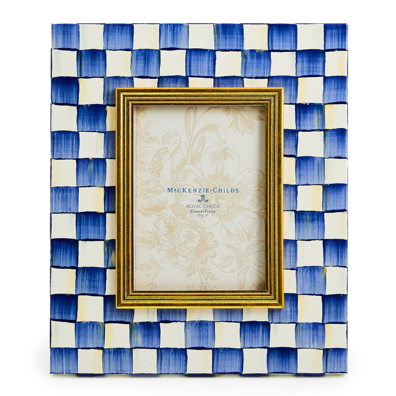 Heavy-gauge, hand-glazed steel underbody with hand-painted Royal Checks. Glass pane. Easel back included; backing is covered with linen and a brass logo plate. Pieces may vary due to the handmade nature of each product. Imported.