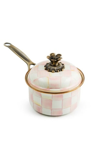 Hand-glazed, heavy-gauge steel underbody with hand-painted Rosy Check decoration, bronzed stainless steel rim, and stainless steel knob with antique brass finish. Pieces may vary due to the handmade nature of each product. Imported.