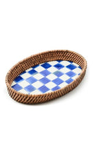Heavy-gauge, hand-glazed steel tray base with hand-painted Royal Checks, rimmed in woven rattan. Pieces may vary due to the handmade nature of each product. Imported.