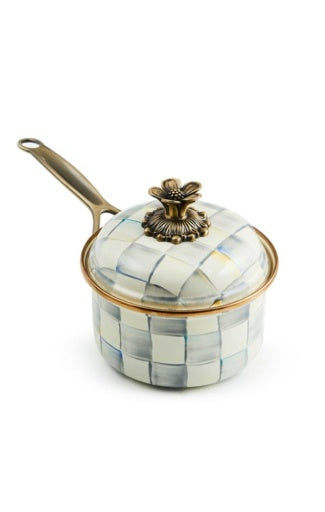 Hand-glazed, heavy-gauge steel underbody with hand-painted Sterling Check decoration, bronzed stainless steel rim, and stainless steel knob with antique brass finish. Pieces may vary due to the handmade nature of each product. Imported.
