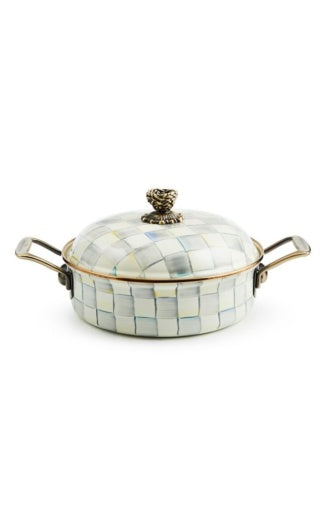 Hand-glazed, heavy-gauge steel underbody with hand-painted Sterling Check decoration, bronzed stainless steel rim, and stainless steel knob with an antique brass finish. Pieces may vary due to the handmade nature of each product. Imported.