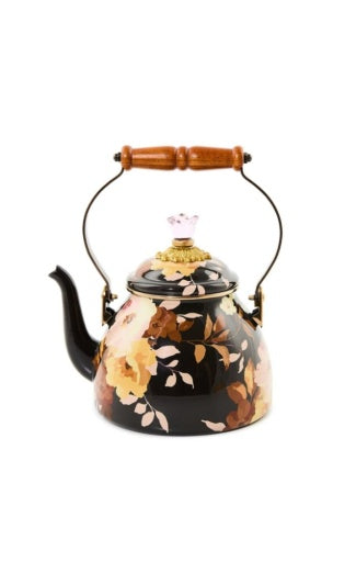 Heavy-gauge, hand-glazed steel underbody embellished with hand-applied transfers, rimmed in bronzed stainless steel. Wood handle. Lid is topped with a glass finial. Pieces may vary due to the handmade nature of each product. Imported.