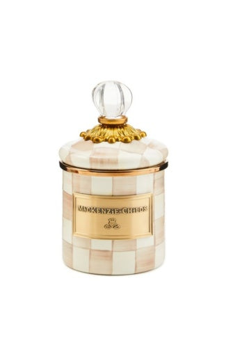 Heavy-gauge, hand-glazed steel underbody with hand-painted Mocha Checks, rimmed in bronzed stainless steel. Brass and glass accents. Silicone seal inside lid. Pieces may vary due to the handmade nature of each product. Imported.