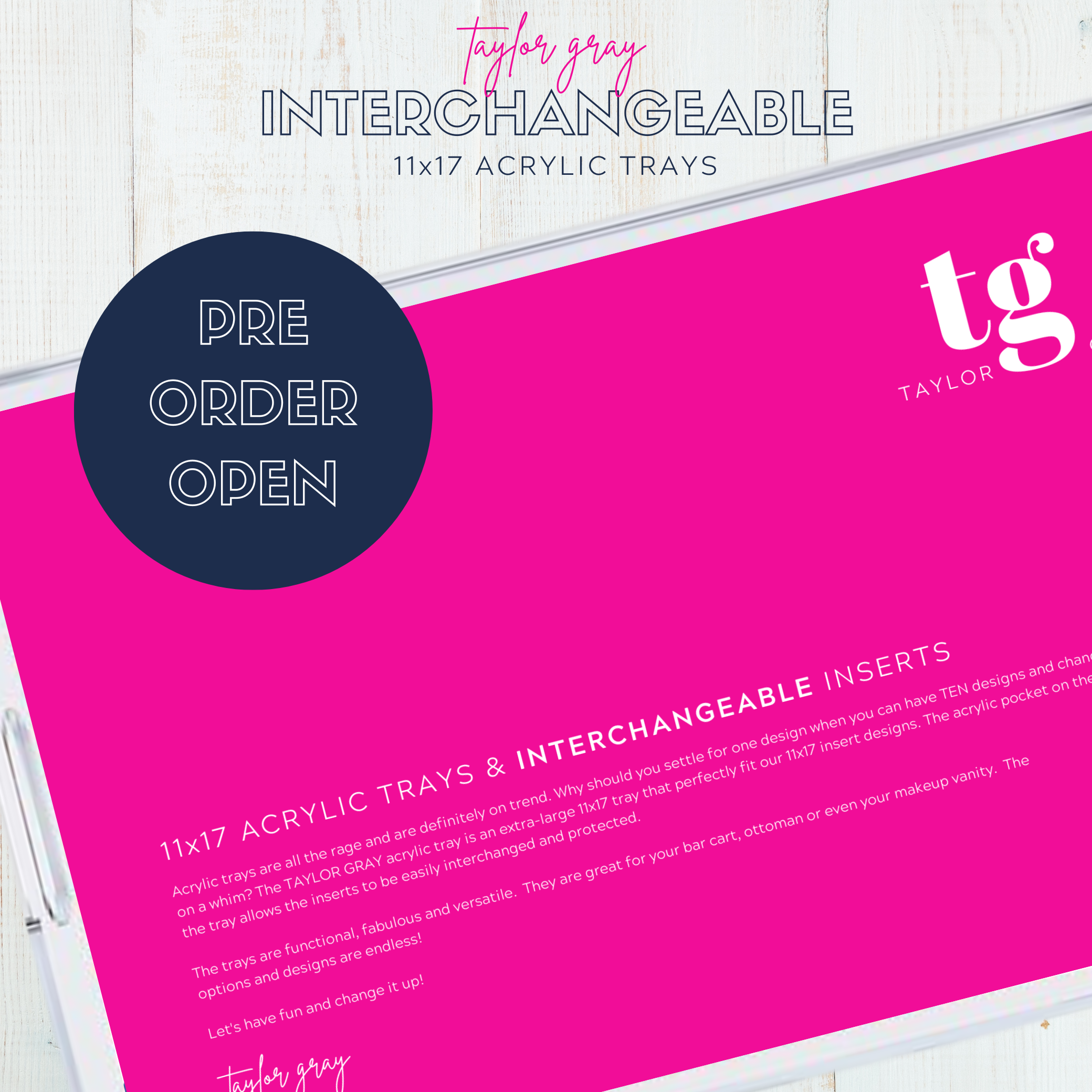 **Acrylic trays are all the rage and are definitely on trend. Why should customers settle for one design when they can have TEN designs and change them out on a whim? The TAYLOR GRAY acrylic tray is an extra-LG 11x17 tray that perfectly fit our 11x17 insert designs. The patent pending pocket on the bottom of the tray allows the inserts to be easily interchanged and protected. The acrylic is also food safe.