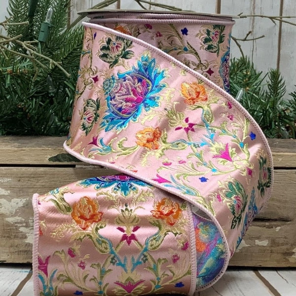 4" X 10YDS JACQUARD ACANTHUS FLORAL, LIGHT PINK