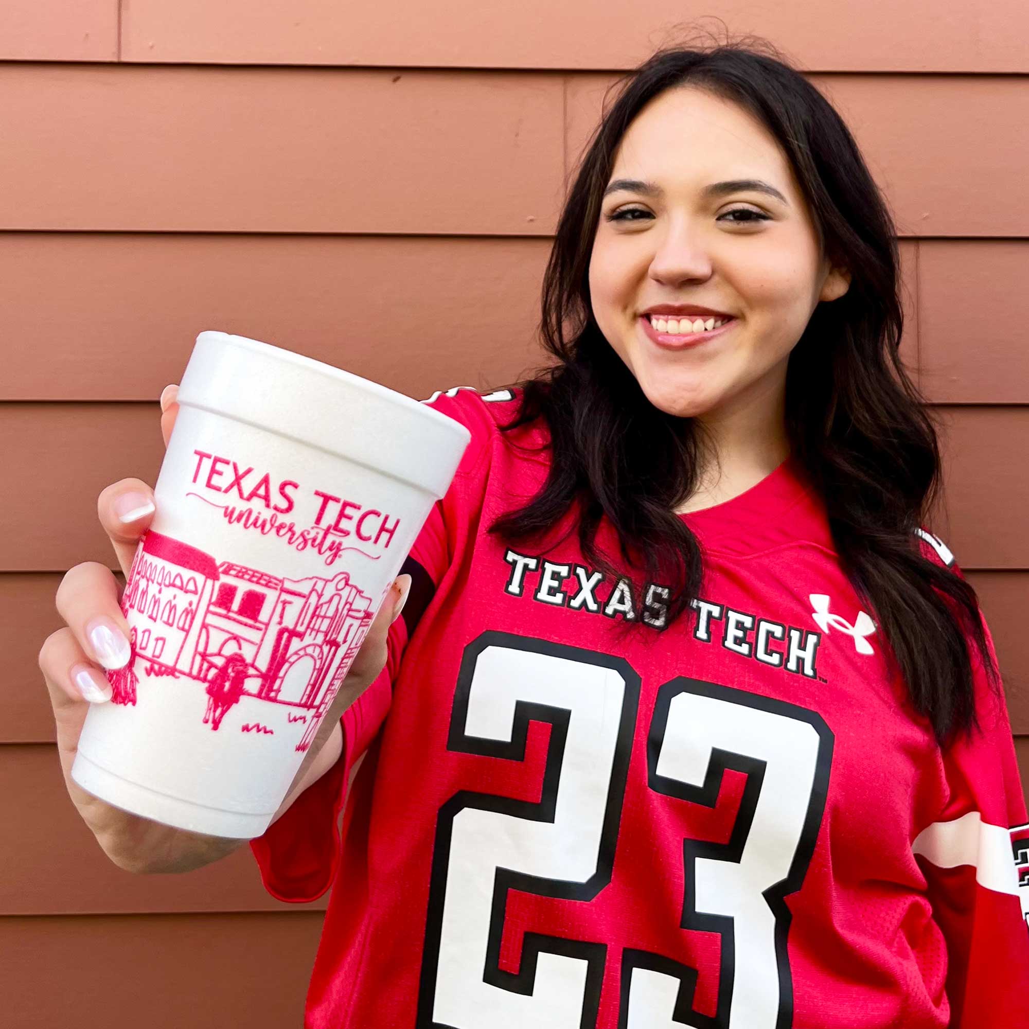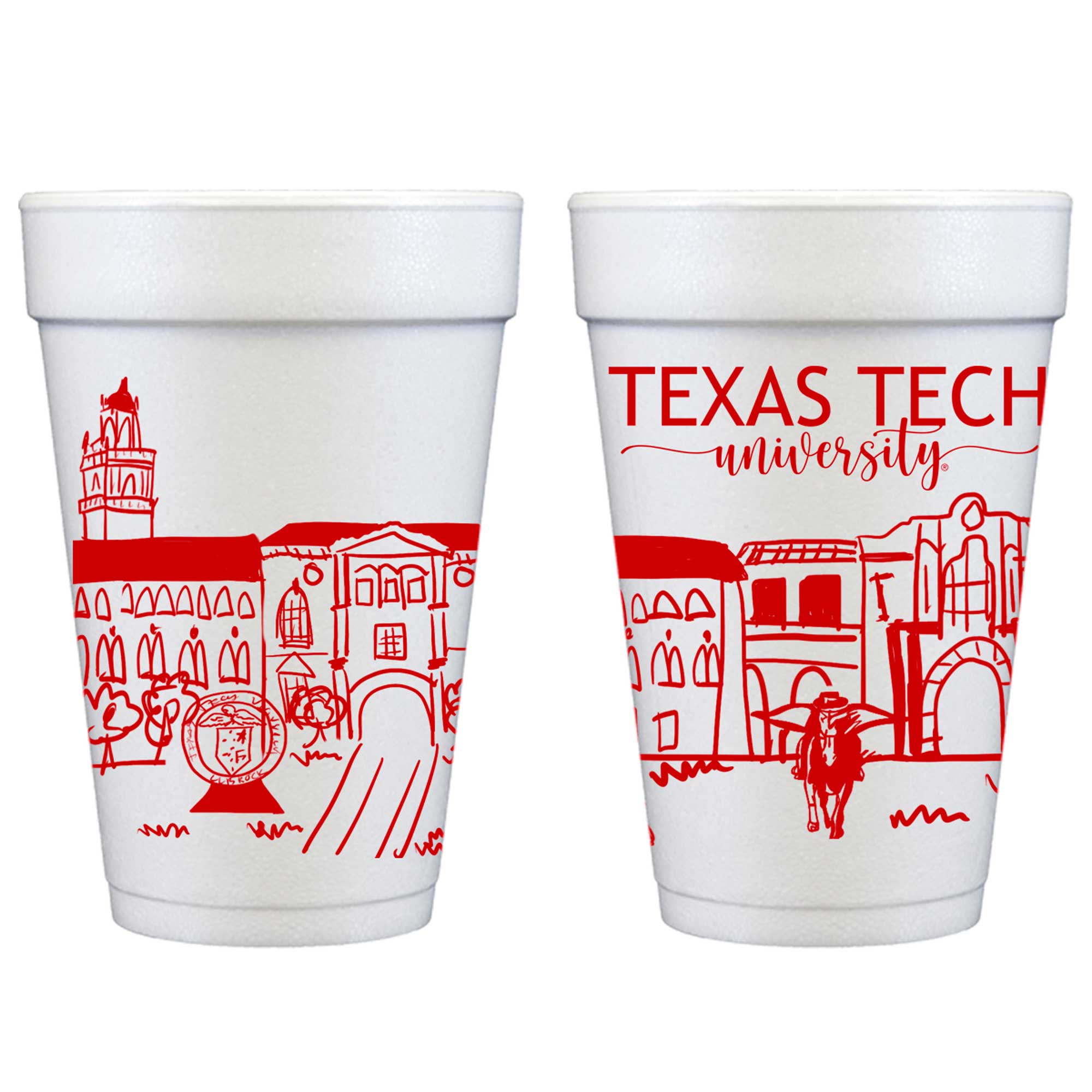 Our foam cups show hand drawn landmarks of the Texas Tech University campus in Lubbock, Texas. These make a great tailgate cup graduation party cup. Officially Licensed Collegiate Product.