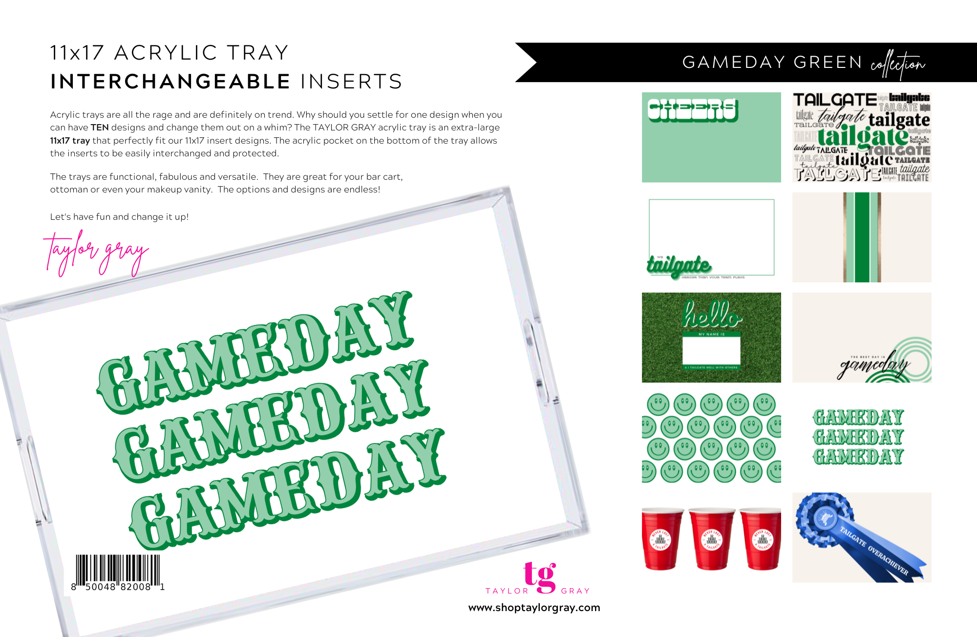 Acrylic trays are all the rage and are definitely on trend. Why should customers settle for one design when they can have TEN designs and change them out on a whim? The TAYLOR GRAY acrylic tray is an extra-LG 11x17 tray that perfectly fit our 11x17 insert designs. The patent pending pocket on the bottom of the tray allows the inserts to be easily interchanged and protected.
