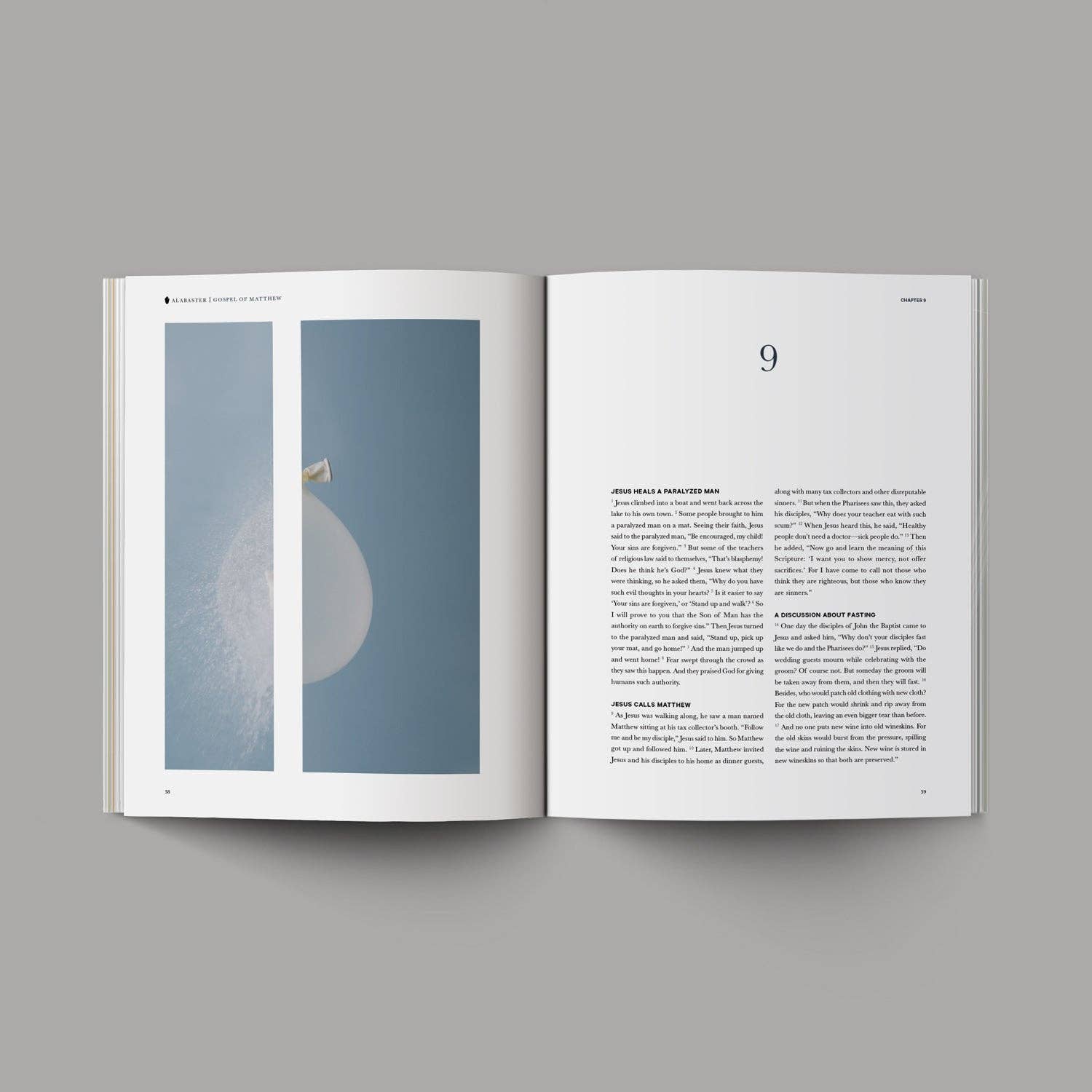 Design aspects: All four Gospels (Matthew, Mark, Luke, and John) in one 480-page book, hardcover smyth-sewn bound, and printed in full color on uncoated paper in Canada. The dimensions are 7.75 in x 9.75 in. Gray cloth cover with silver foil and dust jacket.