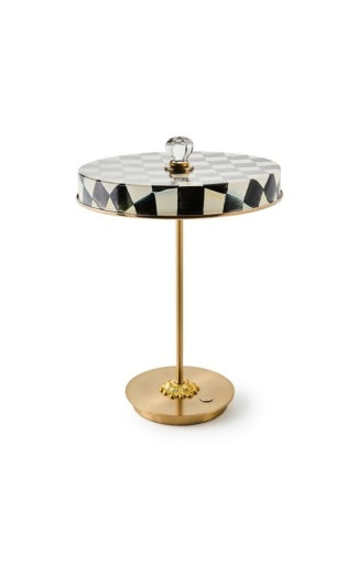 Made of mild steel and glazed enamel with hand-painted checks. Touch on/off with 3 light levels. Rechargeable, lithium-ion battery (3.7V, 2600mAh, 9.62Wh) operated. USB-C charging cord included. Pieces may vary due to the handmade nature of each product. Imported.