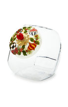 Glass jar; lid has heavy-gauge, hand-glazed steel underbody with hand-applied transfer decoration. Brass and faux cinnabar accents. Pieces may vary due to the handmade nature of each product.