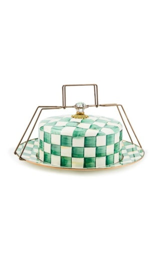 Heavy-gauge steel underbody with hand-painted Emerald Check decoration. Rim, clamp, and handle are bronzed stainless steel. Knob assembly includes brass bobeche and glass finial. Pieces may vary due to the handmade nature of each product. Imported.