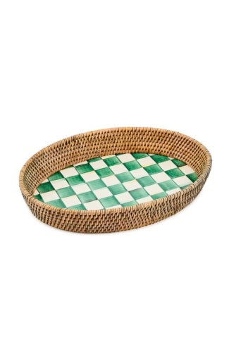 Heavy-gauge, hand-glazed steel tray base with hand-painted Emerald Checks, rimmed in woven rattan. Pieces may vary due to the handmade nature of each product. Imported.