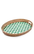 Heavy-gauge, hand-glazed steel tray base with hand-painted Emerald Checks, rimmed in woven rattan. Pieces may vary due to the handmade nature of each product. Imported.
