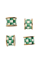 Heavy-gauge, hand-glazed steel underbody with hand-painted Emerald Checks, rimmed in bronzed stainless steel. Boxed set of four. Pieces may vary due to the handmade nature of each product. Imported.