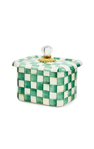 Hand-glazed, heavy-gauge steel underbody with hand-painted Emerald Check decoration, glass knob, and brass accents. Includes set of recipe cards and recipe card dividers. Pieces may vary due to the handmade nature of each product. Imported.