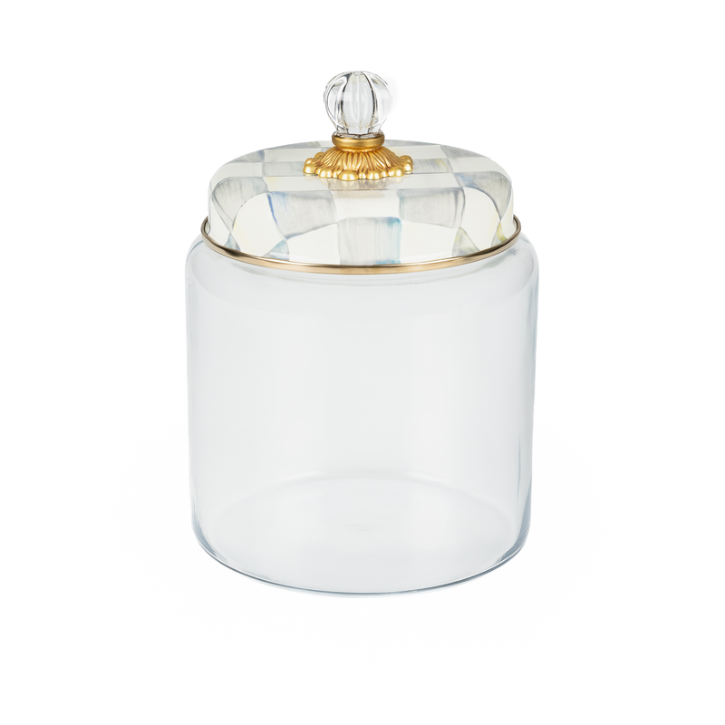 Glass canister and heavy-gauge enameled steel lid rimmed in bronzed stainless steel with faux cinnabar and brass accents. Pieces may vary due to the handmade nature of each product.