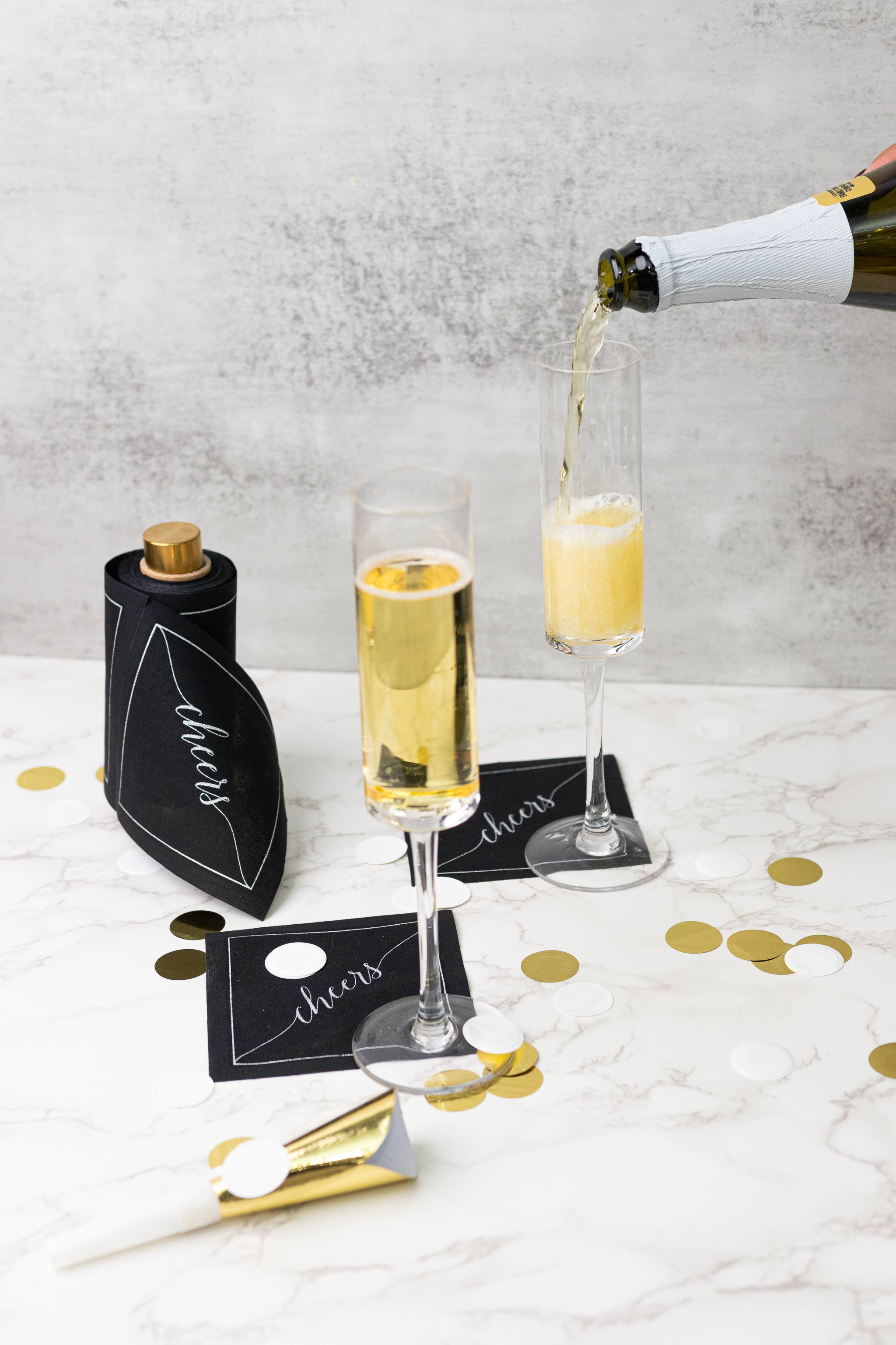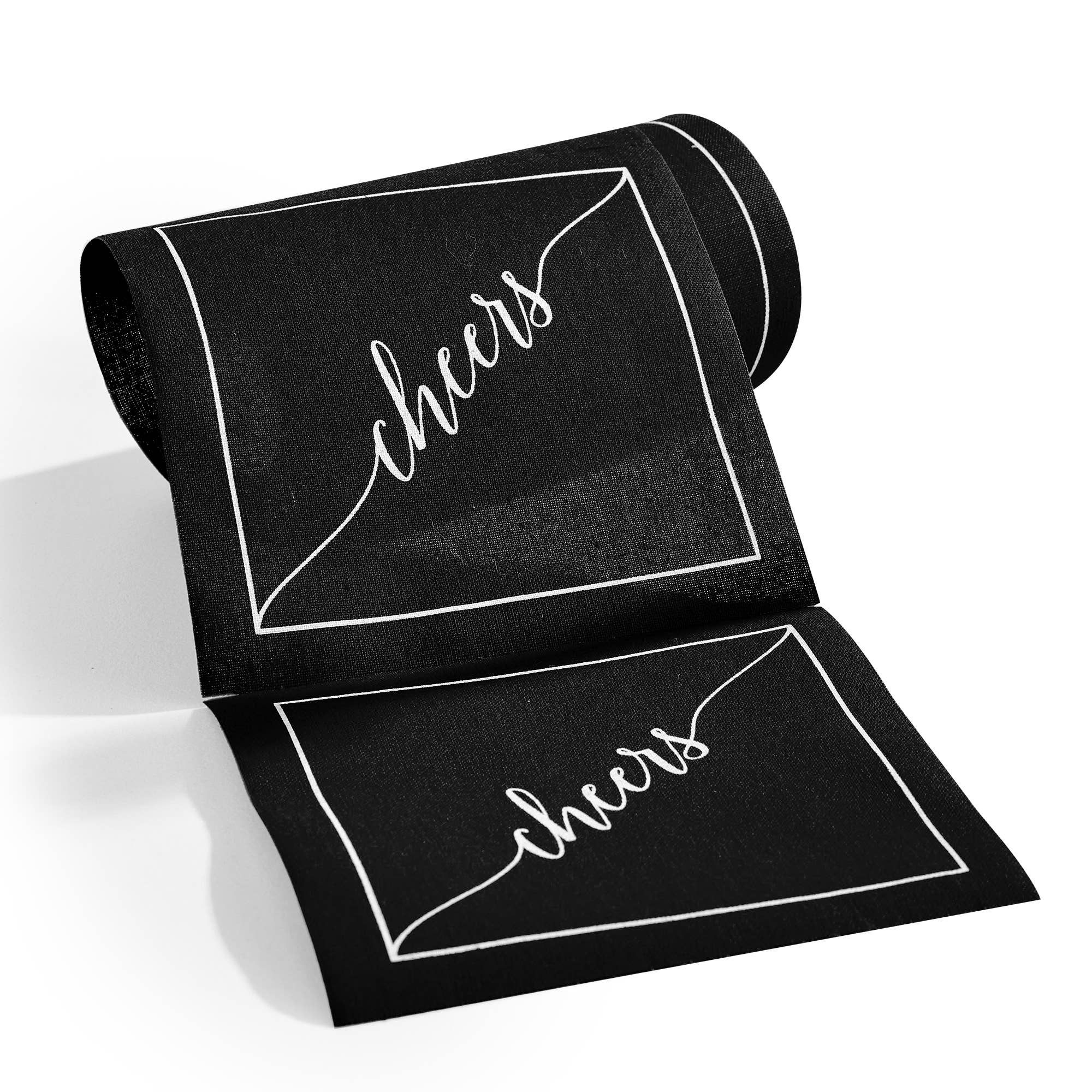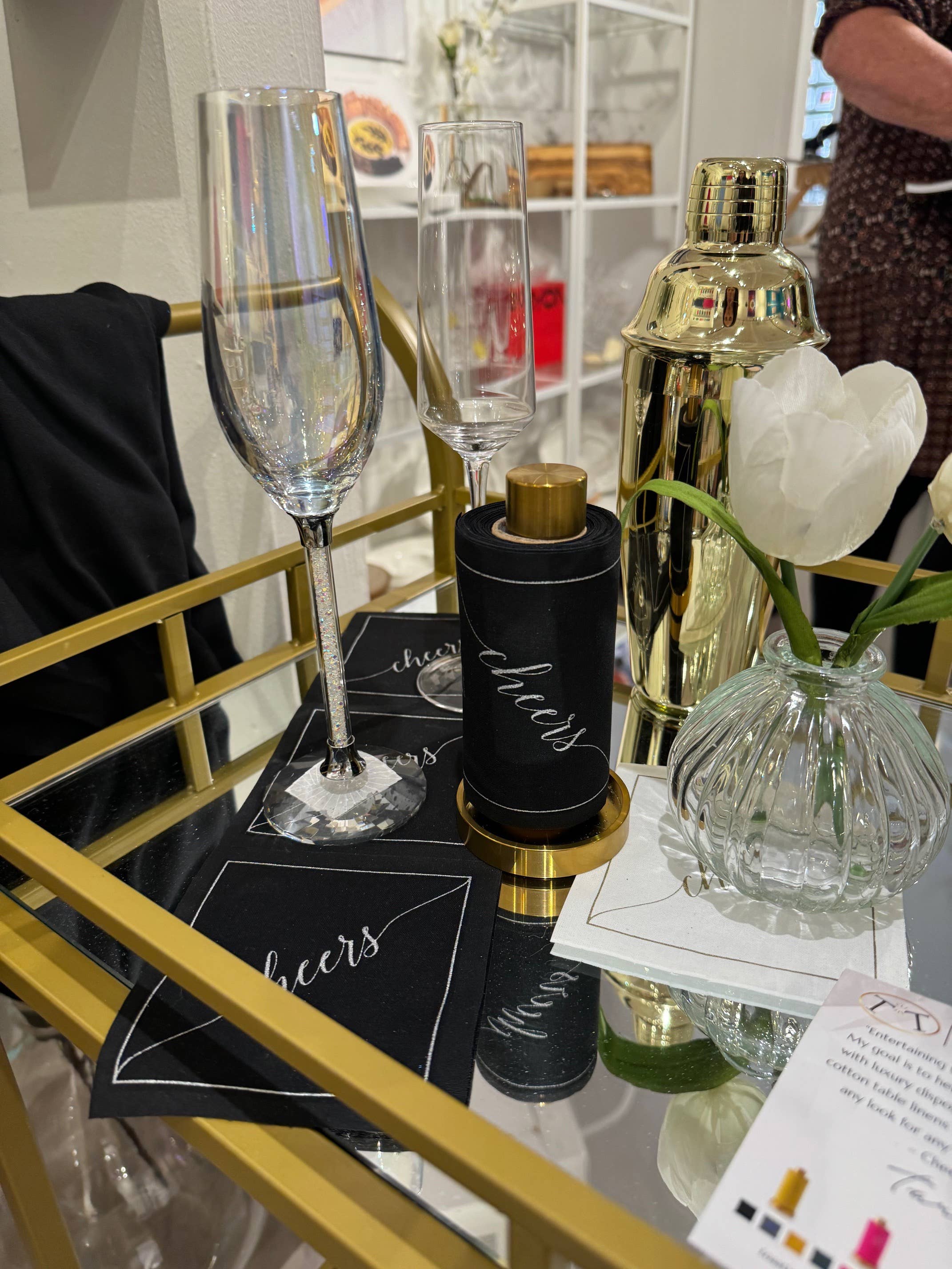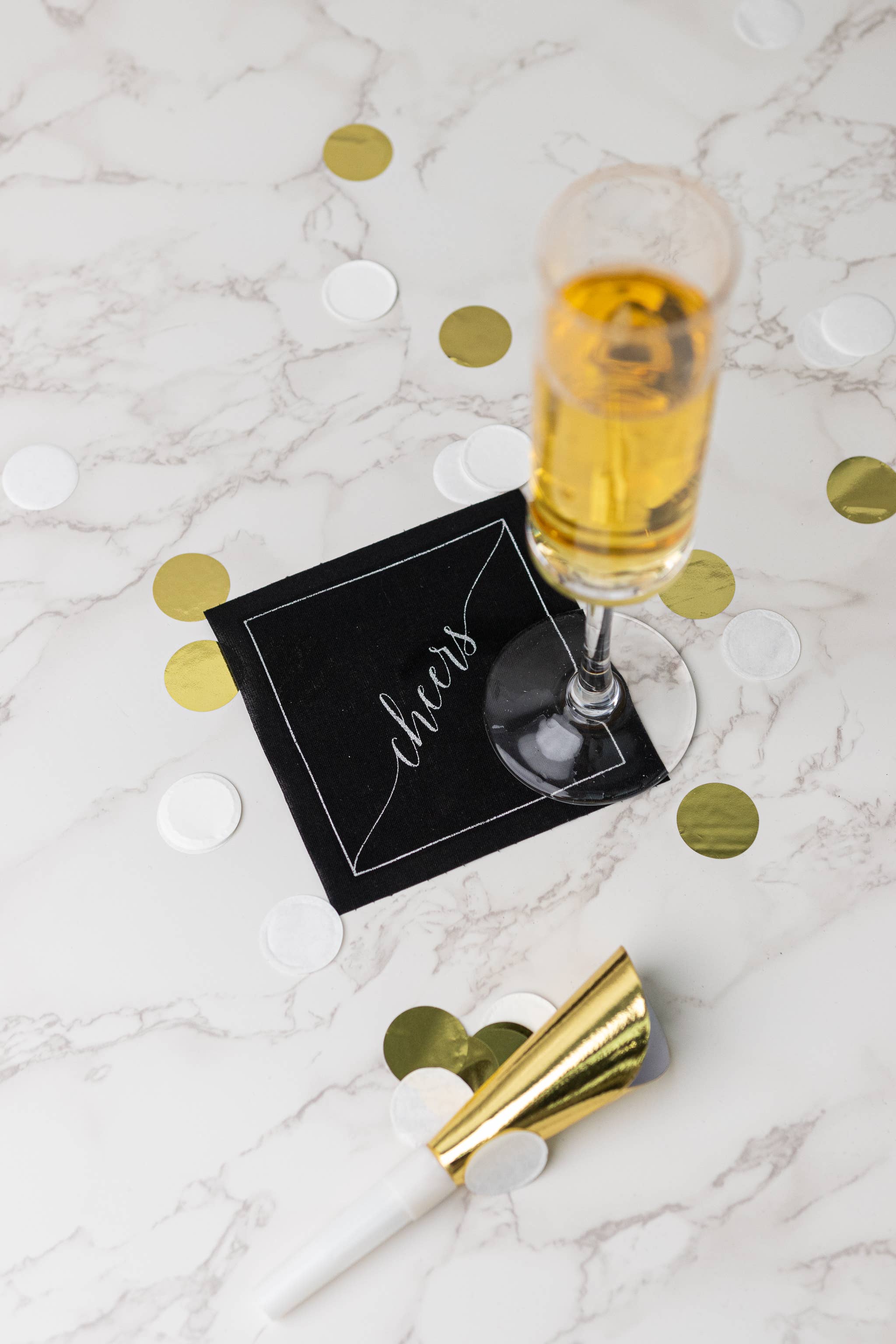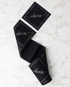 Bold, sleek, and unapologetically dramatic—Midnight Toast brings the party with a true black napkin and metallic silver “cheers” script. Perfect for champagne toasts, modern soirées, and any moment that calls for a touch of glam.