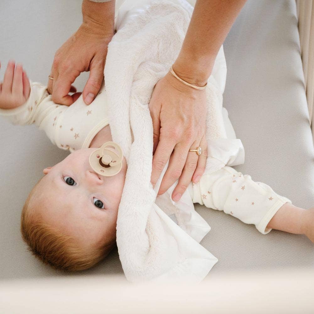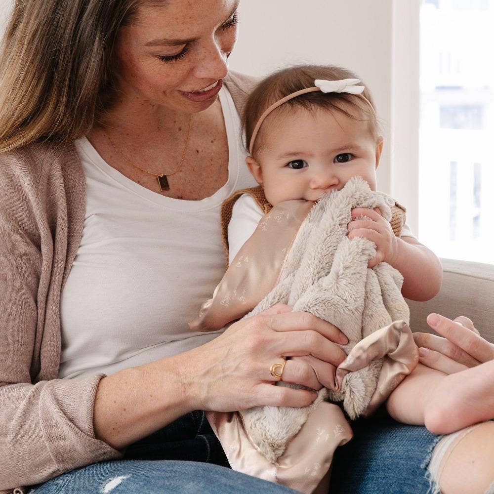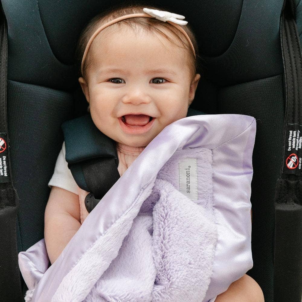 The ultimate in on-the-go comfort, this security blanket is perfect for little hands to grasp. This blanket features a combination of buttery soft lush fabric on the front and a touch of classic satin fabric on the trim making this a classic and timeless choice. Babies love the combination of the two textures on this blanket. You will love that the mini blanket is the perfect size to cover a tiny new baby but as your baby grows, will become a favorite for taking along in the carseat, stroller or keeping in the diaper bag as a lovey to go with you no matter where you go.