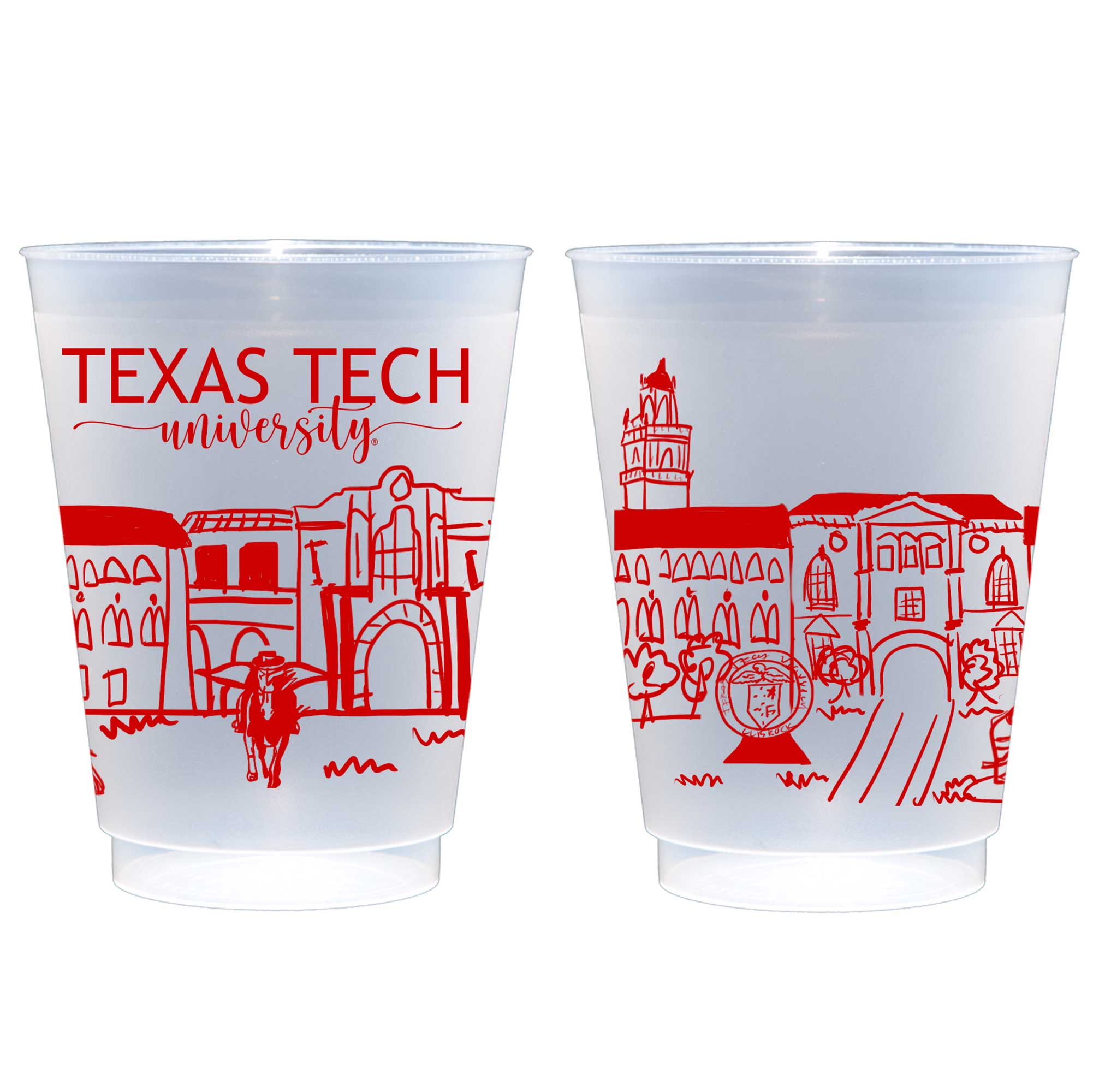 Our hand drawn red roadie cups show landmarks of the Texas Tech University campus in Lubbock, Texas. These make a great tailgate cup graduation party cup.