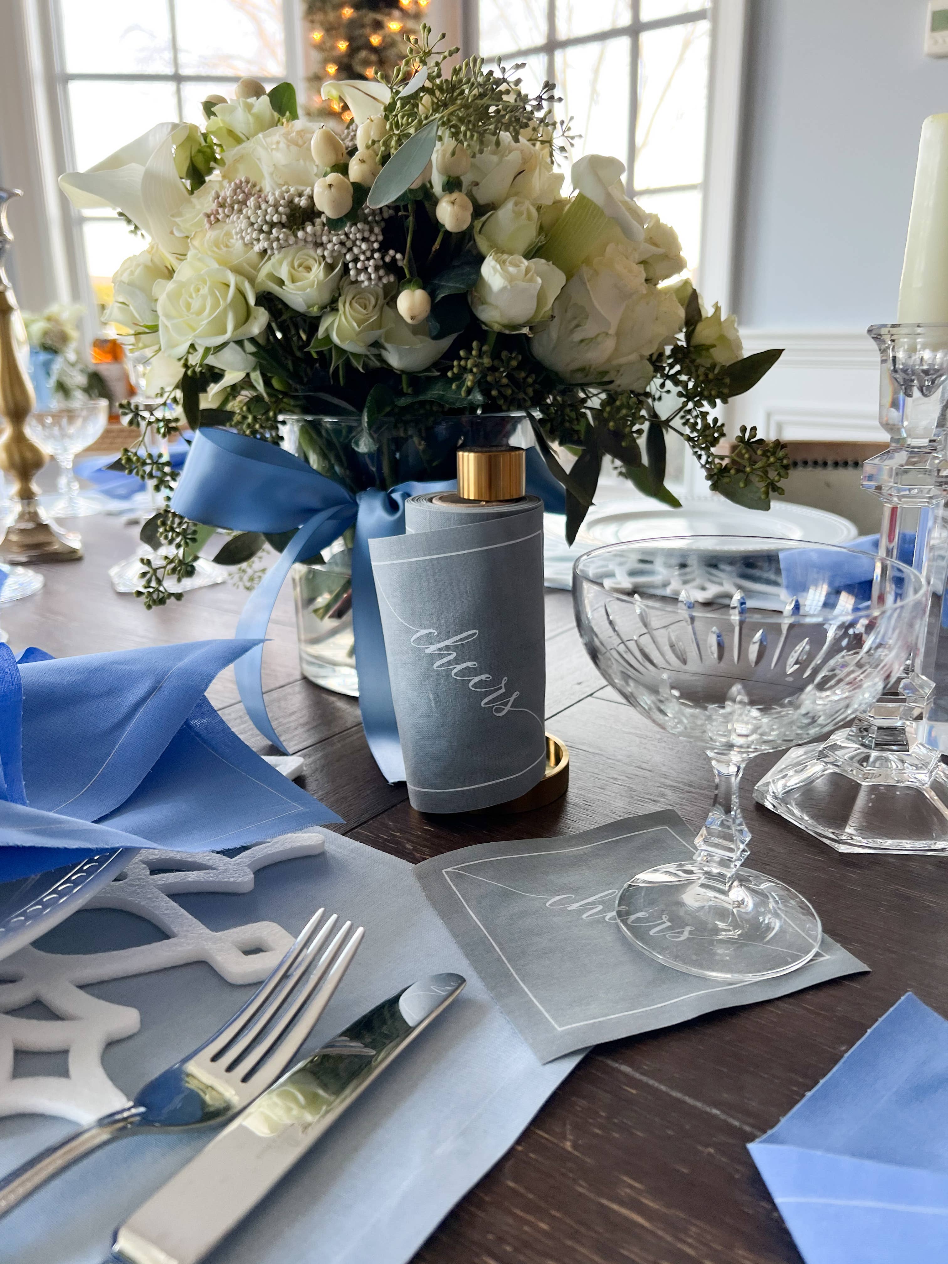 Cool, clean, and quietly luxe—Silver Fox features a soft silver-grey napkin with crisp white “cheers” text. It’s understated yet elevated, the perfect finishing touch for modern, minimalist, or moody tablescapes.