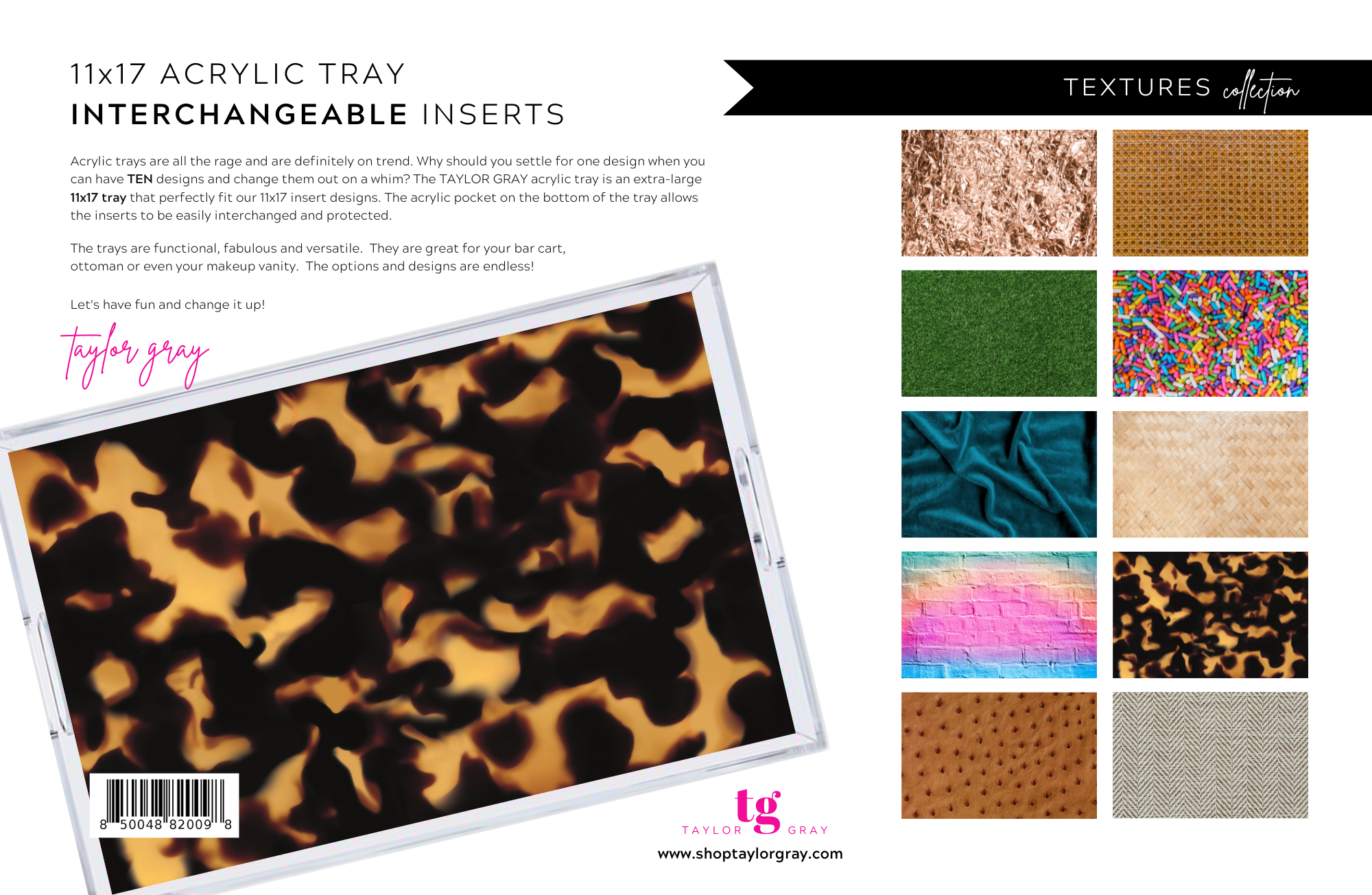 Acrylic trays are all the rage and are definitely on trend. Why should customers settle for one design when they can have TEN designs and change them out on a whim? The TAYLOR GRAY acrylic tray is an extra-LG 11x17 tray that perfectly fit our 11x17 insert designs. The patent pending pocket on the bottom of the tray allows the inserts to be easily interchanged and protected.
